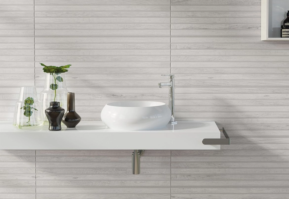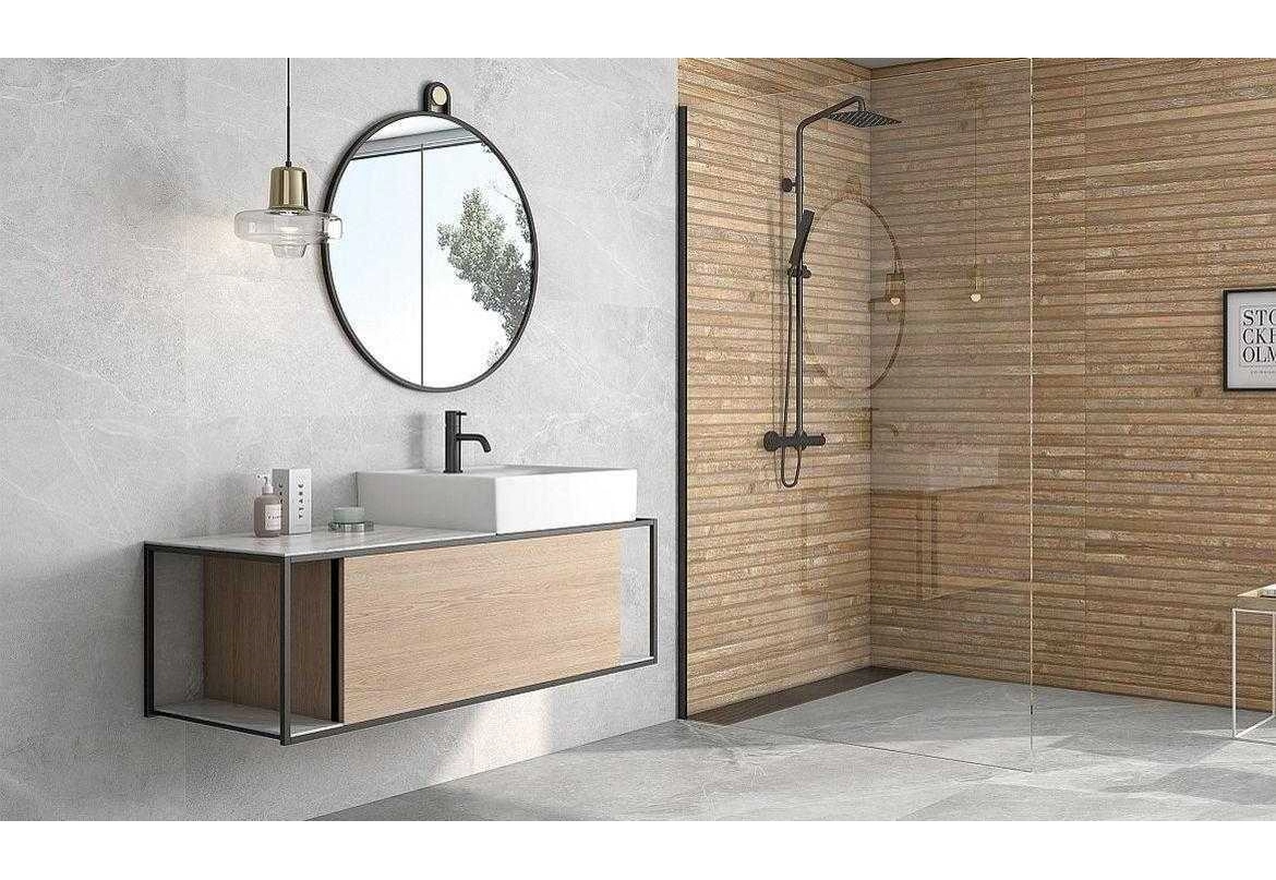 Velkoformátové obklady imitace dřeva. Inspirace koupelny je použití obkladu ve sprchovém koutu, jak doporučují osvědčené metody dekorace ze Skandinávie. Vhodné do kombinace s prvky série BODO.